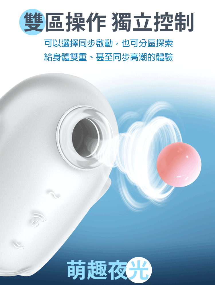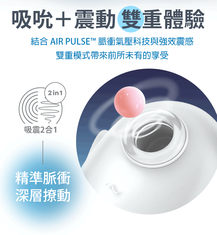 內建 吸吮+震動 2in1 功能,將細膩的氣流吸力與酥麻的震動結合,帶來雙倍愉悅體驗。無論是溫柔探索,還是急速挑逗,都能滿足你的渴望。